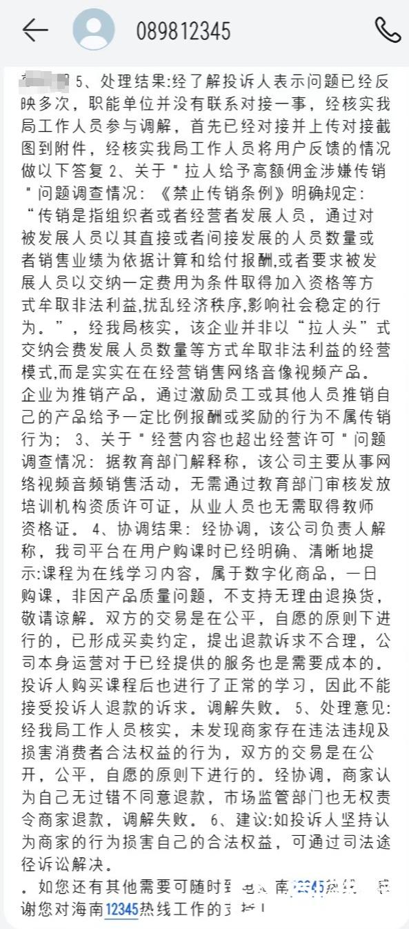 针对刘芳反映的“退费难”“拉人给予高额佣金涉嫌传销”等问题,9月5日,海南12345热线答复:经海南省海口市市场监督管理局龙华分局核实,未发现商家存在违法违规及损害消费者合法权益的行为,双方的交易是在公开、公平、自愿的原则下进行的。商家认为自己无过错不同意退款,市场监管部门也无权责令商家退款,调解失败。建议投诉人通过司法途径进行诉讼解决。