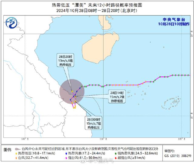 今天(10月28日)上午8时,热带低压“潭美”的中心位于越南岘港市境内,中心附近最大风力7级(15米/秒)。受冷空气和“潭美”减弱后的热带低压影响,28日14时至29日14时,南海北部及中西部、琼州海峡、北部湾以及广东、广西、海南岛等地沿海将有6至7级大风、阵风8至9级。其中北部湾偏南海域风力可达8级、阵风9至10级。雷州半岛将有大雨,海南岛将有暴雨或大暴雨,局地有250至320毫米的特大暴雨。