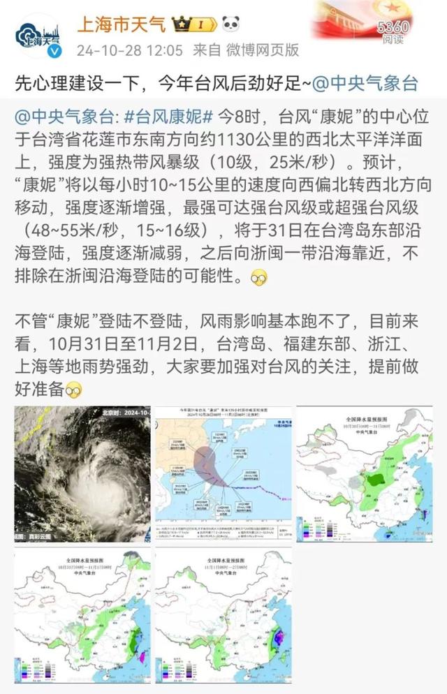 据上海中心气象台,11月1日前后,上海可能受到“康妮”外围偏东气流影响。由于台风路径仍存在变数,需要密切关注最新动态。