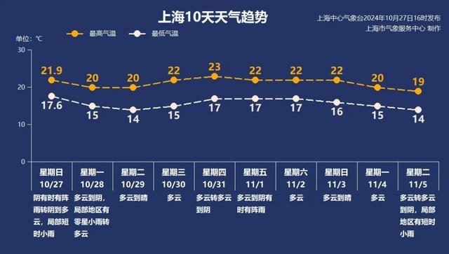 今天,上海以多云到阴天气为主,局部地区有短时小雨。偏北风4-5级,沿江沿海地区阵风有6级,夜里起风力减弱。受冷空气影响,气温进一步下降,白天最高气温20℃左右。夜间气温更低,预计市区最低气温15℃附近,郊区更低,晚归注意及时添加衣物。