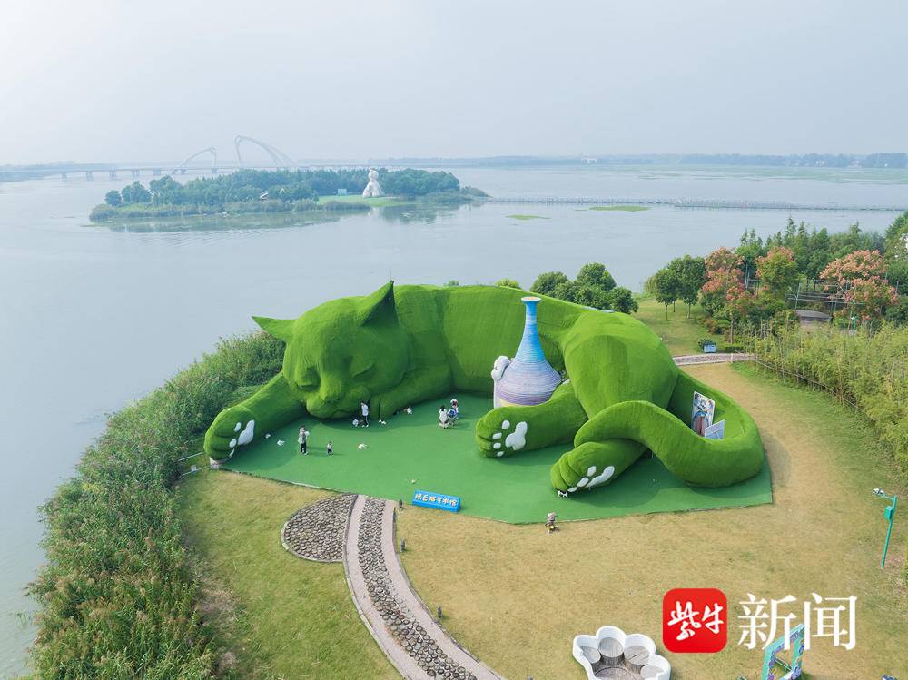 上岛,首先映入记者眼帘的是一座绿巨猫雕塑,超尺度的外观,憨态可掬的外型引来众多游客争相打卡拍照。“绿巨猫长 30 米,高 8.7 米,内部空间约 180 平方米,设 有一个入口和一个出口。”景区负责人朱菲告诉记者,肥猫岛2020年10月份正式开始营业,初衷是想做一个疗愈系的景区,绿巨猫内部是一个艺术展览馆,不定期举办“名人与猫”、“电影里的猫”、“汉服展”等主题丰富的文化展出。