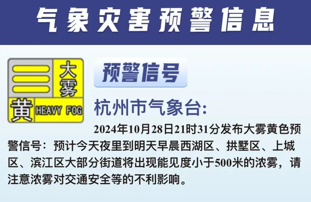 杭州市气象台2024年10月28日21时31分发布大雾黄色预警信号:预计28日夜里到29日早晨西湖区、拱墅区、上城区、滨江区大部分街道将出现能见度小于500米的浓雾,请注意浓雾对交通安全等的不利影响。