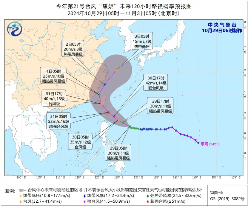 大风预报:29日08时至30日08时,受冷空气和“康妮”的共同影响,黄海南部、东海大部、南海北部、北部湾、琼州海峡、台湾海峡、巴士海峡、台湾以东洋面、浙江沿海、福建沿海、广东沿海、广西沿海、海南岛沿海、台湾岛沿海有6-7级大风,阵风8-9级;其中台湾海峡、台湾以东洋面、巴士海峡、福建沿海、台湾岛沿海的风力有8-9级,阵风10-11级。