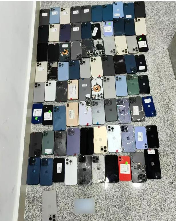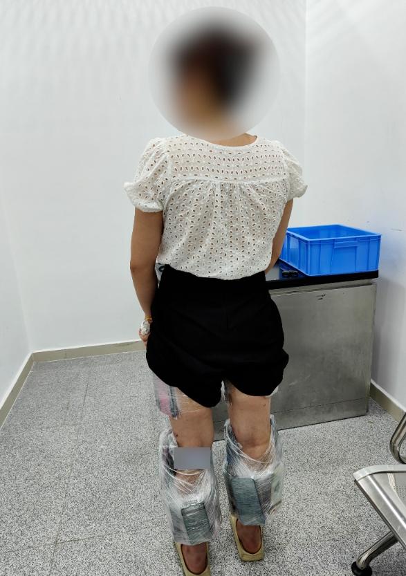 当天22时许,身穿白色上衣、宽松长裤的内地女子杨某经拱北口岸旅检大厅海关“无申报通道”进境。现场关员察觉发现该女子步伐沉重、走路姿势僵硬,遂将其截查。经进一步查验,关员从其双腿大腿及小腿处查获大量用塑料薄膜绑藏的旧手机,数量共计74台。