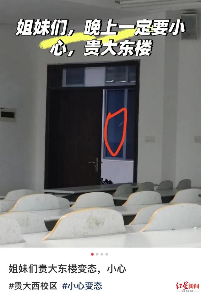 记者注意到,一网友发文称,10月26日晚上在贵州大学西校区东楼学习时,疑似被人偷窥和尾随进厕所。据该网友描述,她在学习时察觉有一名男性透过窗户盯着她,一开始以为是错觉没有在意,没想到过了一段时间那个人还在看,网友感到害怕准备收拾书回去。被网友发现后,这名男性迅速离开,网友收完书出来后,发现那个人又在隔壁教室盯着她。网友说此前去厕所时,进厕所前后面没有人跟着进来,但是上厕所时却听到有脚步声,冲水发出声音后,脚步声又迅速离开。
