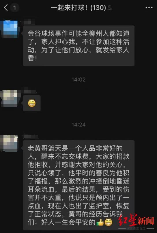在该视频的评论区,红星新闻注意到,有疑似知情的网友发出一张微信聊天截图,称白衣男子已无大碍。截图中,一用户称“老黄哥篮天是一个人品非常好的人,醒来不忘交球费,大家的捐款他拒收,并感谢大家对他的关心……那么激烈的冲撞倒地昏迷耳朵流血,最后的结果,受到的伤害并不太重,他说只是颅内出了一点血,现在人也出了监护室,恢复了正常状态。”
