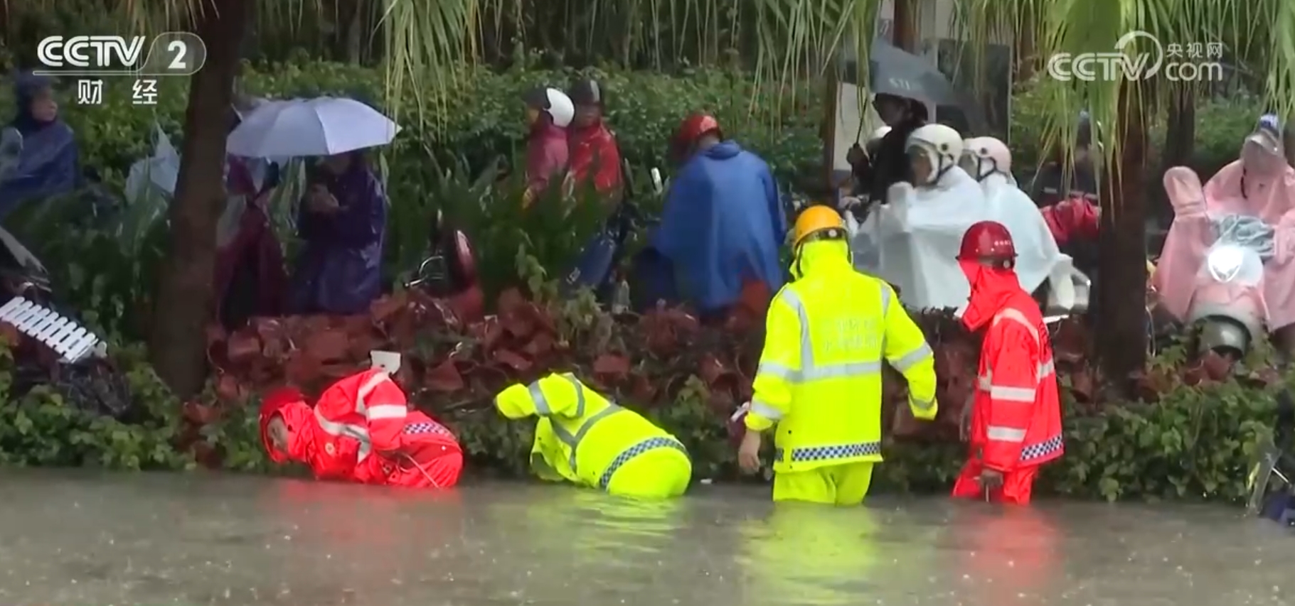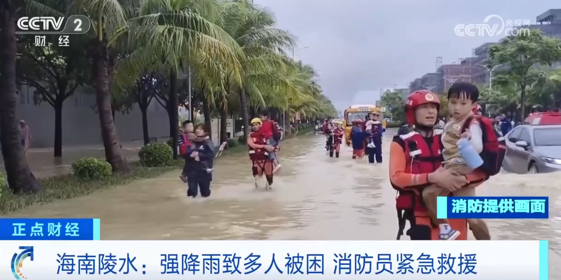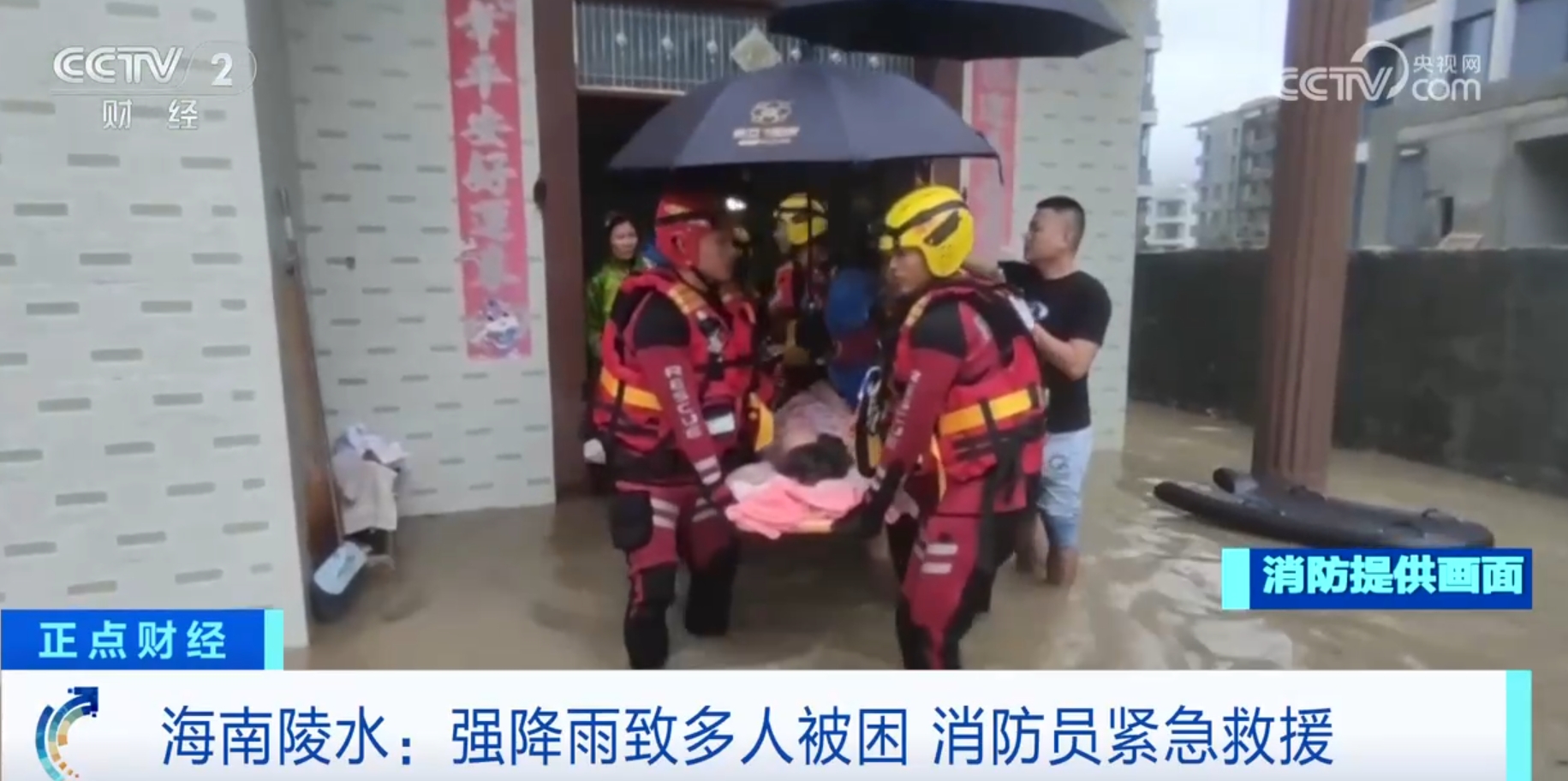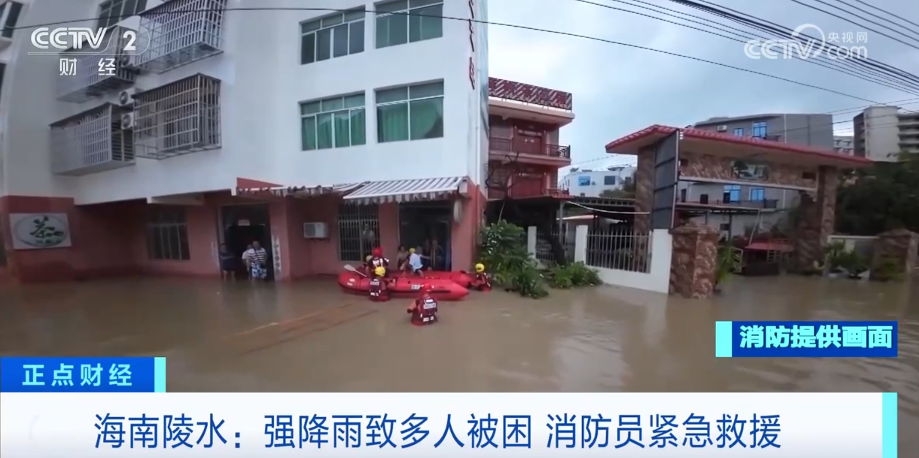 28日,海南陵水县全域出现强降雨,并导致内涝,部分道路和民房被淹,有多名人员被困,消防员紧急救援。