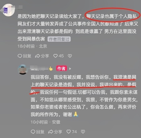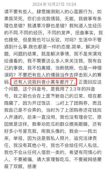 10月28日晚,该账号博主开启直播,与网友简短交流之后便下线了。博主在直播中表示,“我要做自己了,我也希望接下来,更多的人不要去造谣了。”博主对部分网友关于其大闹LV柜姐时所提到的“聊天记录”进行了回应:“我澄清是网上的聊天记录是造假,我并没有说,我讲出来的,是假的。”