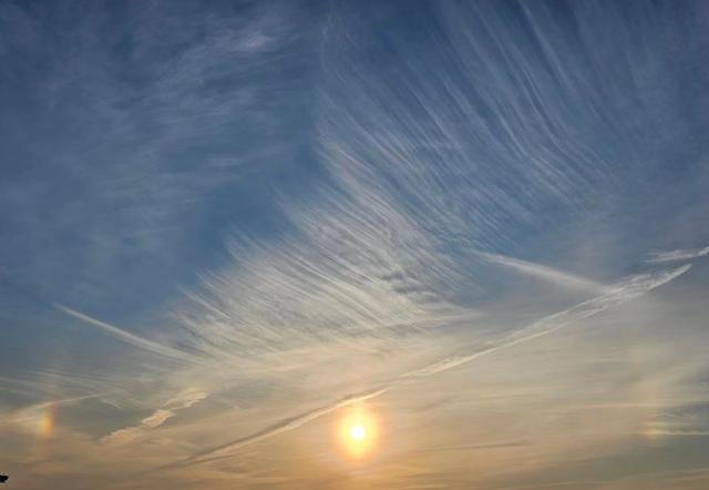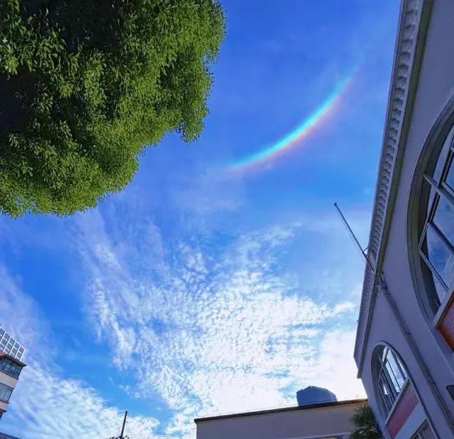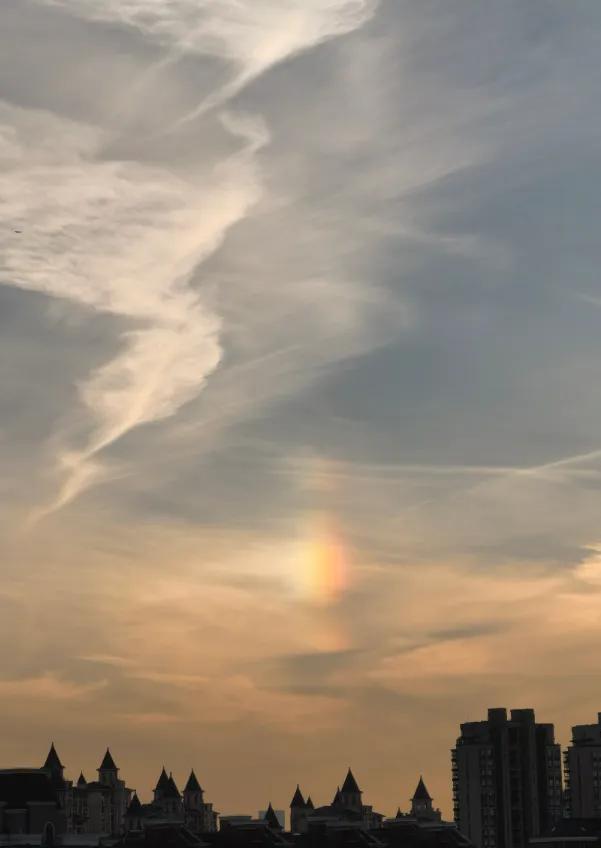 市气象部门表示,这种现象叫做“环天顶弧”。其实和“日晕”一样,环天顶弧也是大气光学现象,是阳光经过云中的小水滴或小冰晶发生折射产生的彩色光晕。环天顶弧是阳光经过云中的扁平六角冰晶折射后形成的,一般出现在早晨和傍晚的天顶附近,所以称为“环天顶弧”。它如同挂在天空的一抹微笑,因此也有“天空的微笑”的说法。
