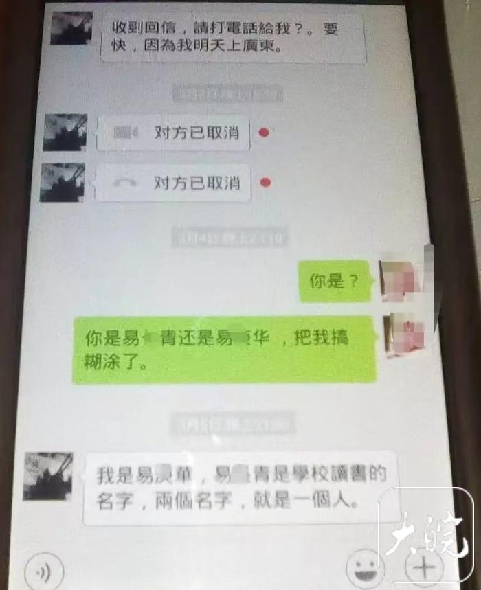 一张微信聊天截图显示,易某华说,“收到回信,请打电话给我。要快,因为我明天上广东。”李海玉问,“你是?”“易某青还是易某华,把我搞糊涂了。”