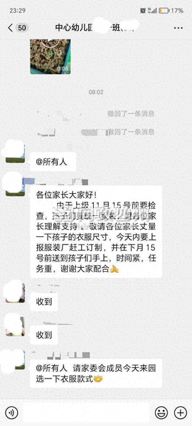 记者注意到,在“问政四川”留言板上,网民称,“校服价格240一件,而且现在每月还要交100元托管费和每天7元一餐的伙食费,以上这些莫名的费用学校还强制必须要交,以上这些费用是否合理,幼儿园买什么校服,马上还有半年又要上1年级了,又要买校服,是不是增加了学生家长的经济负担。”网民还配了一张班级群聊记录,群中有疑似老师的人发布信息称“由于上级11月15号前要检查,孩子们要统一服装,望各位家长理解支持。”