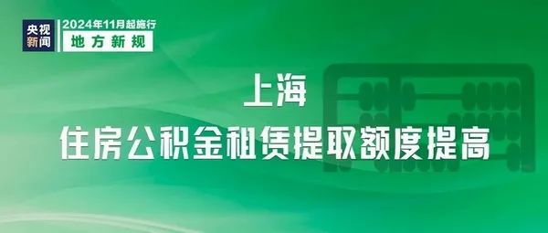 上海市住房公积金管理委员会发布的《关于优化本市住房公积金租赁提取业务相关事项的通知》(沪公积金管委会〔2024〕6号),将于2024年11月1日起施行。承租上海市保障性租赁住房的,每户家庭(含单身家庭,下同)可按实际房租支出提取。承租该市市场租赁住房的,每户家庭月提取限额由3000元提高为4000元。