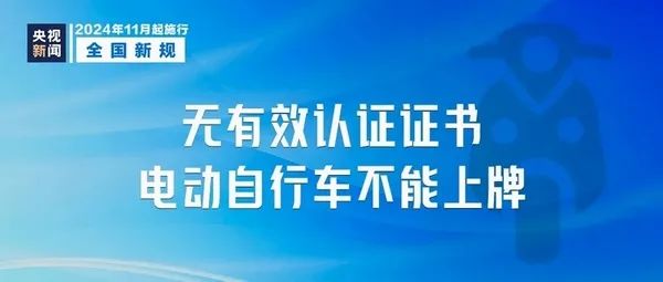 国家市场监管总局、工业和信息化部、公安部、国家消防救援局发布的《关于加强电动自行车产品准入及行业规范管理的公告》,自2024年11月1日起。根据新规,不符合《电动自行车电气安全要求》等相关强制性国家标准的电动自行车,不得生产、销售、进口;对2024年11月1日后销售的、不具有有效认证证书的电动自行车不予办理登记上牌。