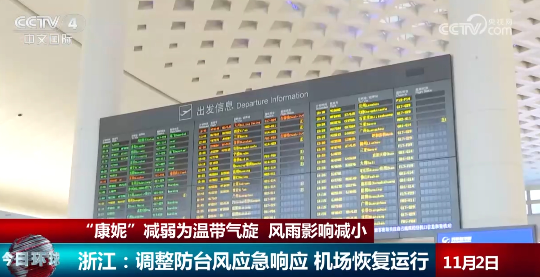 随着“康妮”逐渐远离,浙江省防指已于11月1日下午5时将防台风应急响应从二级调整为三级。此前,受台风影响,杭州萧山国际机场取消涉及福建沿海、华南等方向的进出港航班107架次。11月1日下午,随着天气逐渐好转,杭州萧山国际机场已恢复正常运行。