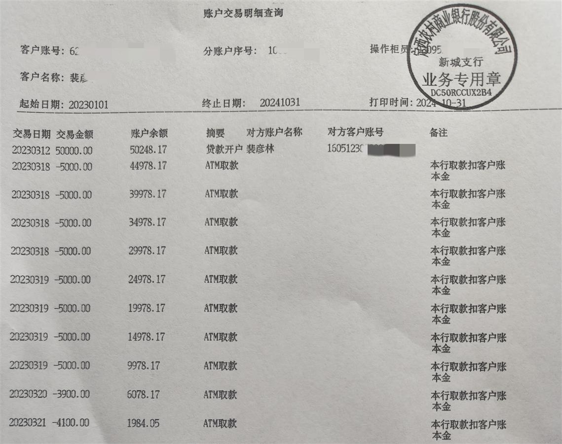 裴某林提到,贷完款后,莫某要走了银行卡和密码。裴某林提供的银行流水单显示,2023年3月18日至21日从该账户ATM取款10次,共计4.8万元。他说,这4.8万元是莫某取的,2000元留在卡里扣息。