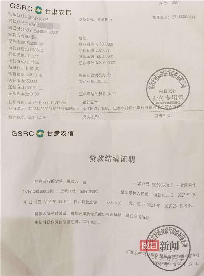 11月1日,记者陪同裴某林到银行查询,这笔5万元的贴息贷款已于今年10月23日结清。