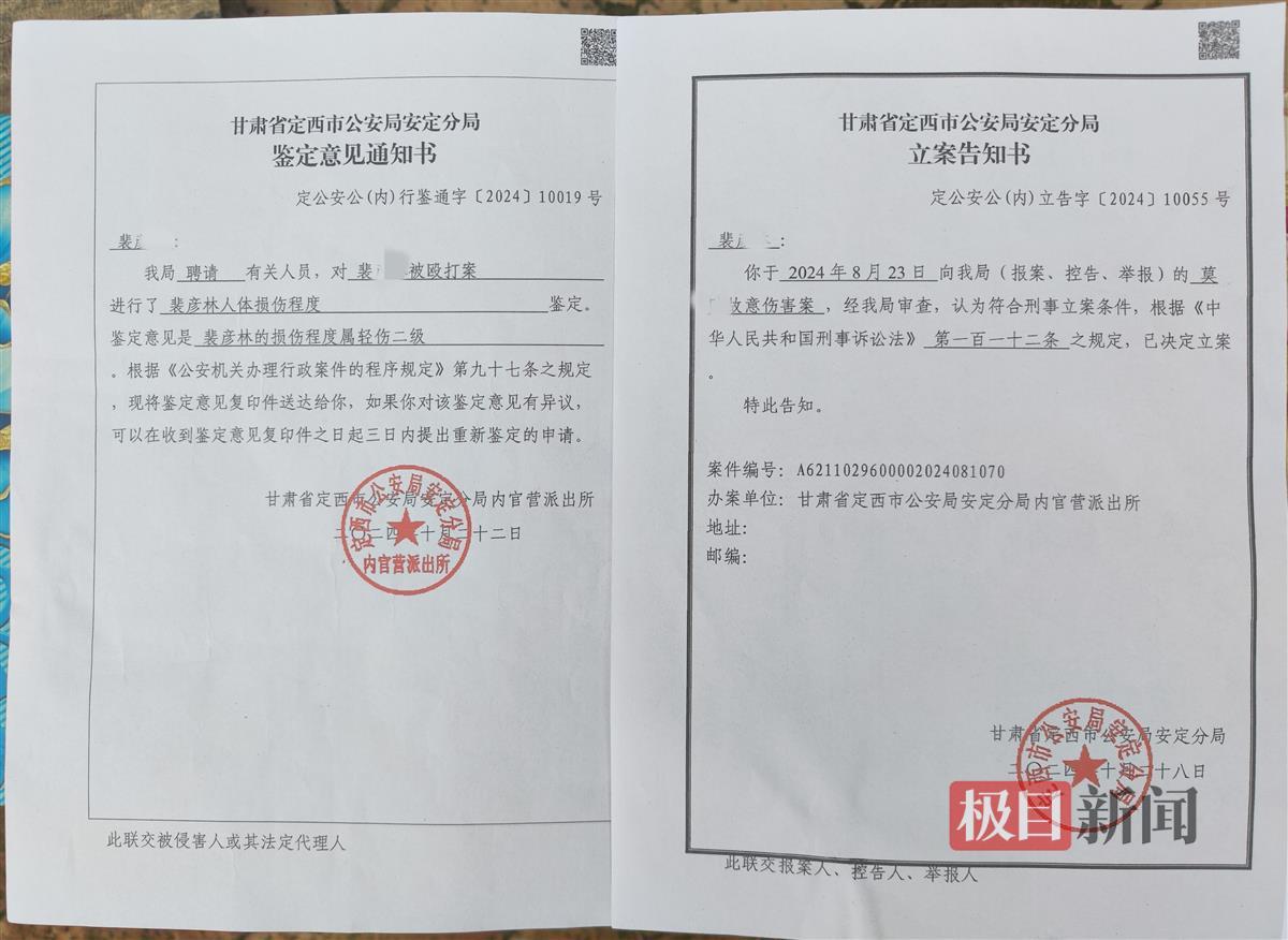 定西市安定区公安机关10月22日出具的鉴定意见通知书显示,该局聘请有关人员对“裴某林被殴打案”中裴某林的人体损伤程度进行了鉴定,结果为轻伤二级。10月29日,内官营镇派出所民警通知裴某林,莫某故意伤害案已刑事立案。