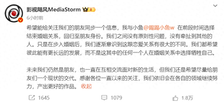 11月5日凌晨,@影视飓风MediaStorm 发文:“希望能给关注我们的朋友同步一个信息,我与小鱼@踢踢小鱼w 在前段时间选择结束婚姻关系,回归至朋友身份。我们之间没有原则性问题,没有牵扯到其他的人。只是在步入婚姻后,我们逐渐意识到这跟恋爱关系有很大的不同。我们都希望彼此能有更长远的发展,而不是这其中的任何一个人在婚姻关系中选择牺牲自己。