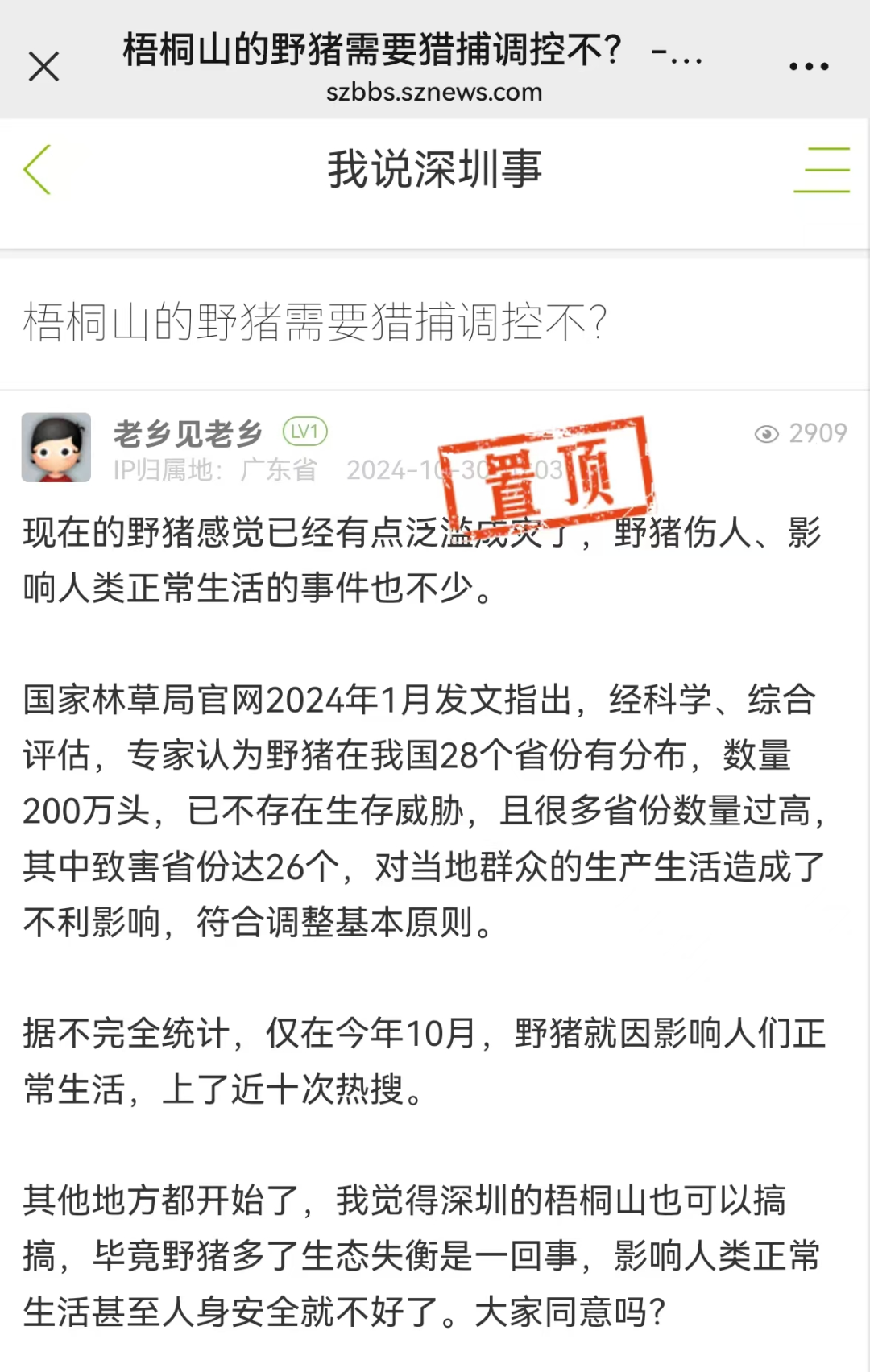 近日,就有网友在深圳论坛发帖提问,其他地方都开始对野猪进行治理了,梧桐山的野猪需要猎捕调控不?