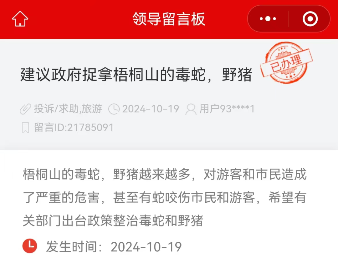 另外,还有网友在人民网“领导留言板”反映,梧桐山的毒蛇,野猪越来越多,对游客和市民造成了严重的危害,甚至有蛇咬伤市民和游客,希望有关部门出台政策整治毒蛇和野猪。