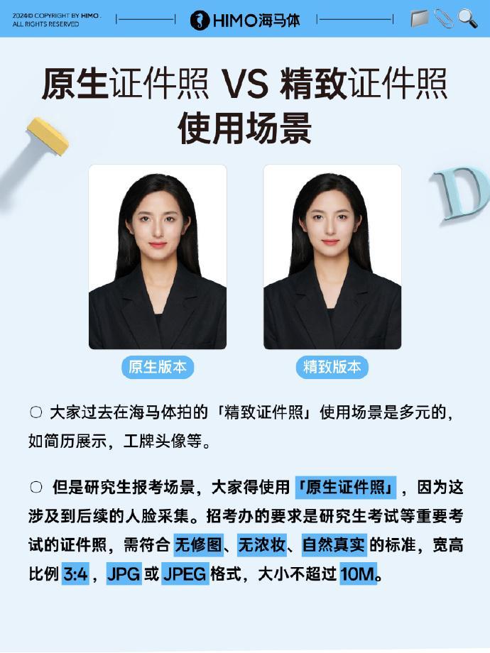 大家过去在海马体拍的精致证件照是满足多元使用场景的,比如简历展示、工牌头像等。但在研究生报考场景中,大家务必使用原生版证件照,因为这涉及到后续的人脸采集。招考办的要求是研究生考试等重要考试的证件照,需符合无修图、无浓妆、自然真实的标准,宽高比例3:4 ,JPG或JPEG格式,大小不超过10M。
