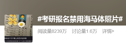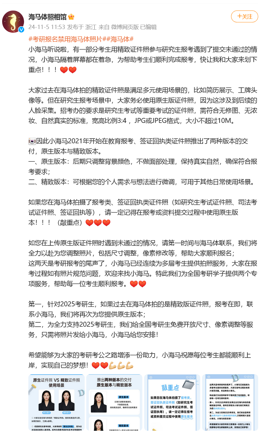 11月5日,针对“考研报名禁用海马体照片”的热搜,海马体照相馆官博发文回应。