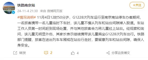 11月4日晚,@铁路南京站发布情况说明:“4日12时50分许,G1228次列车运行至南京南站停车办客期间,一名旅客携带一名儿童临时下车时,该儿童不慎从列车和站台间隙掉入股道。车站工作人员第一时间赶到现场处置,并与其他旅客合力将儿童拉上站台。”