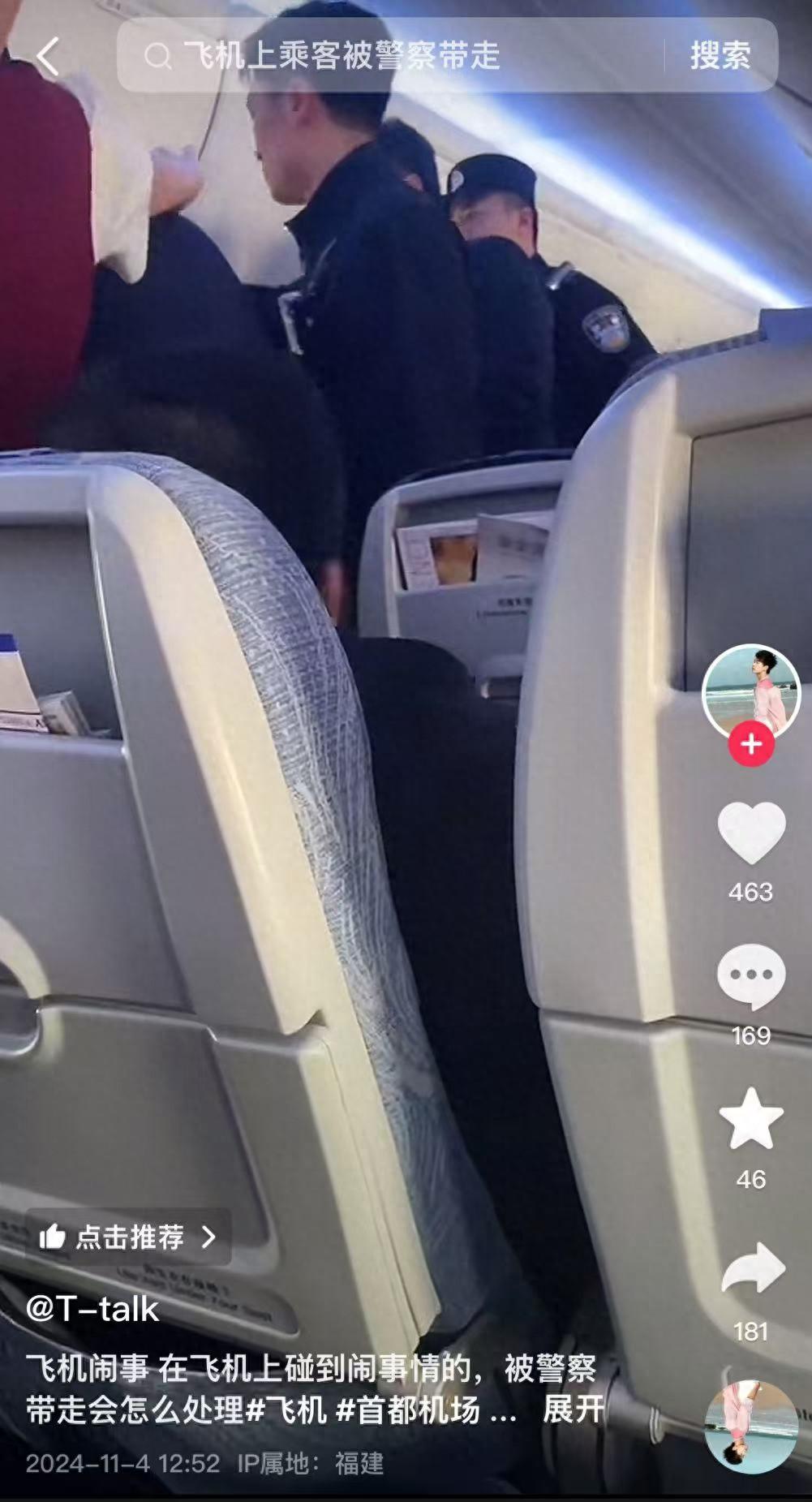 11月4日,抖音用户@T-talk发布视频称,11月2日在首都机场乘坐国航航班时,一名女乘客在飞机即将起飞时要求下飞机,引发网友热议。