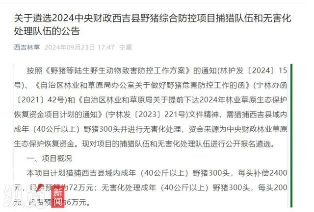 此外,陕西、四川、宁夏等地为调控野猪数量,也公开招募“赏金猎人”。今年9月23日,宁夏西吉县林草局发布《关于遴选2024中央财政西吉县野猪综合防控项目捕猎队伍和无害化处理队伍的公告》称,计划猎捕西吉县域内成年(40公斤以上)野猪300头,每头补偿2400元,经费预算为72万元;无害化处理成年(40公斤以上)野猪300头,每头200元,经费预算为6万元。