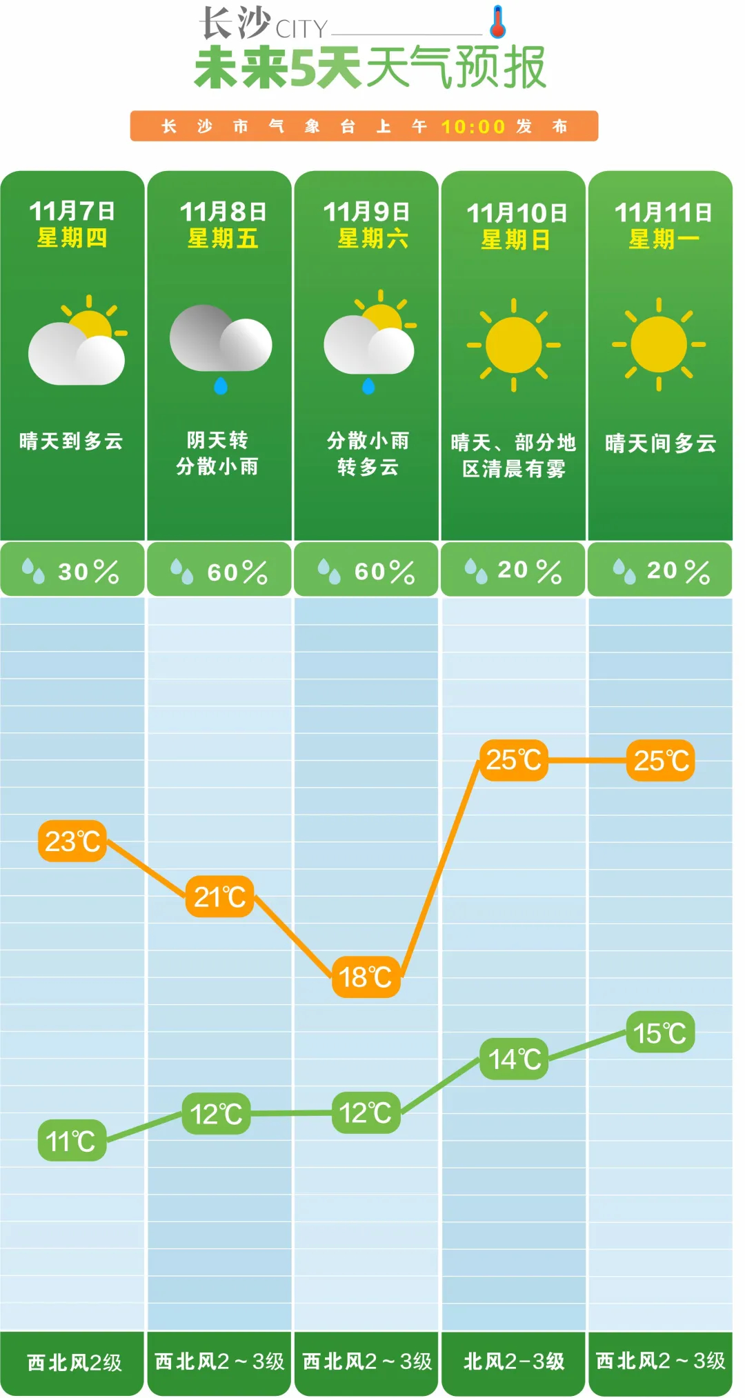 据中国天气,长沙在11-12日,最高气温可达25℃左右,温暖如春。