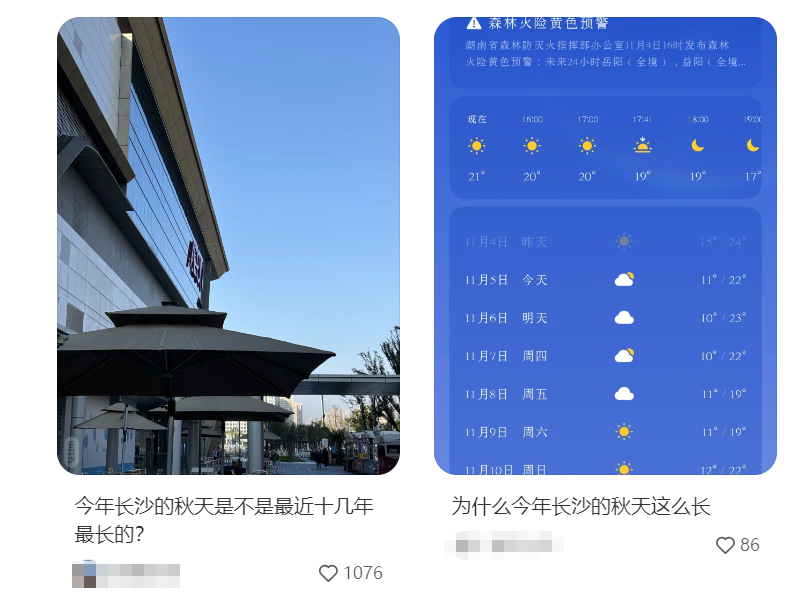 “每天都有太阳,晚上又不是很冷,真的很惬意。 盖的被子不用太厚,不用担心着凉。真的太美好了”“舒服到让我感觉这不是长沙了”“往年这个时候穿羽绒服,还湿冷湿冷的”“以前十一后基本一个星期然后开始阴天阴雨一个月!”“以往长沙秋天是断断续续的,但是也能持续到十一月多,主要是一会儿冷一会儿热的,今年这么持久的热天气还挺少见的”“最夸张的时候甚至一秒变冬天,今天短袖明天棉袄”“今年秋天真的蛮长,因为我发现没几件秋天的衣服穿了”……饱受“湿冷”攻击的长沙人,今年可以尽情享受秋风送爽了。