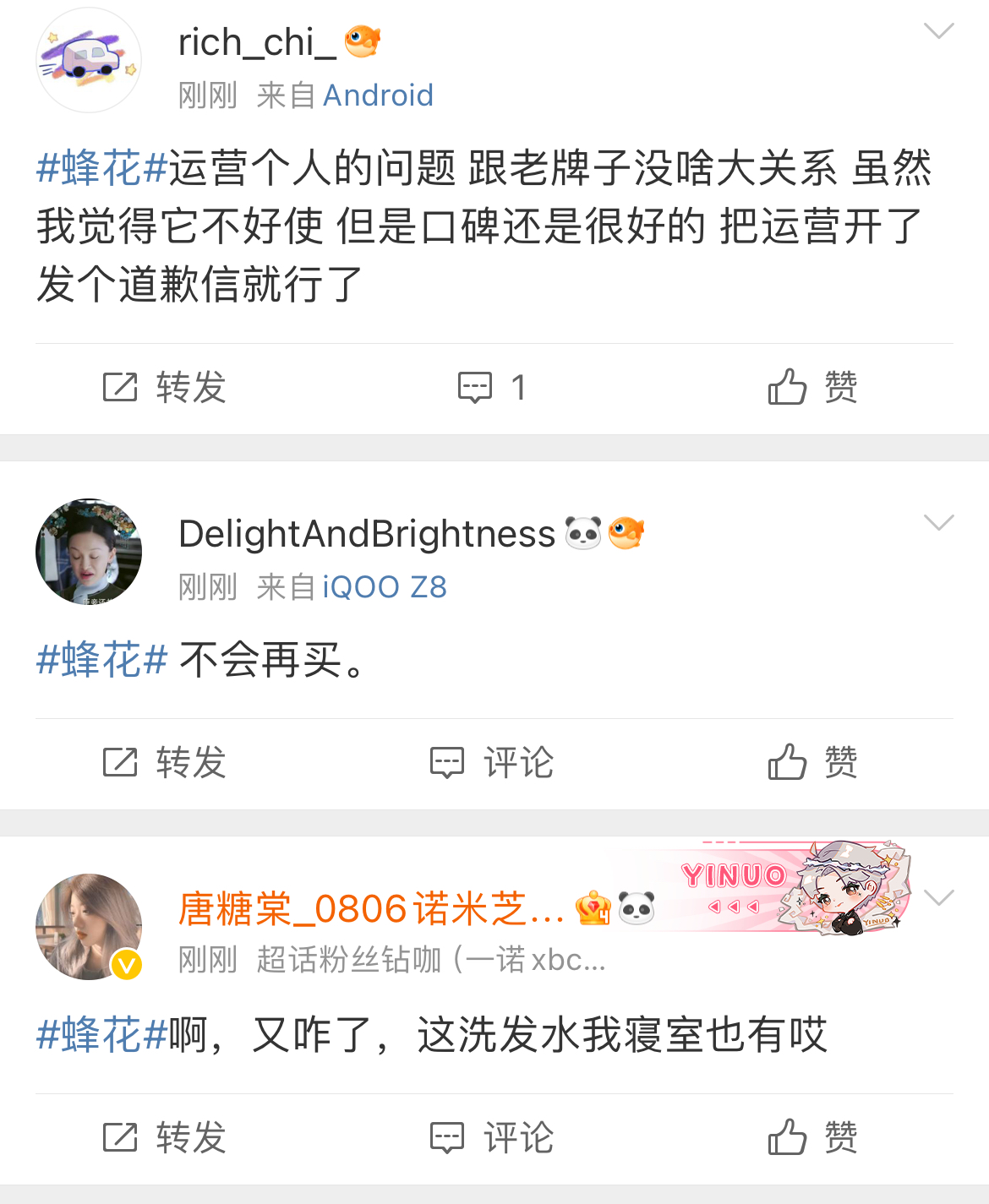 记者目前在蜂花官方账号搜索发现,该账号已删除真假闺蜜漫画的动态。但在最新动态下,已有不少网友表示避雷蜂花。