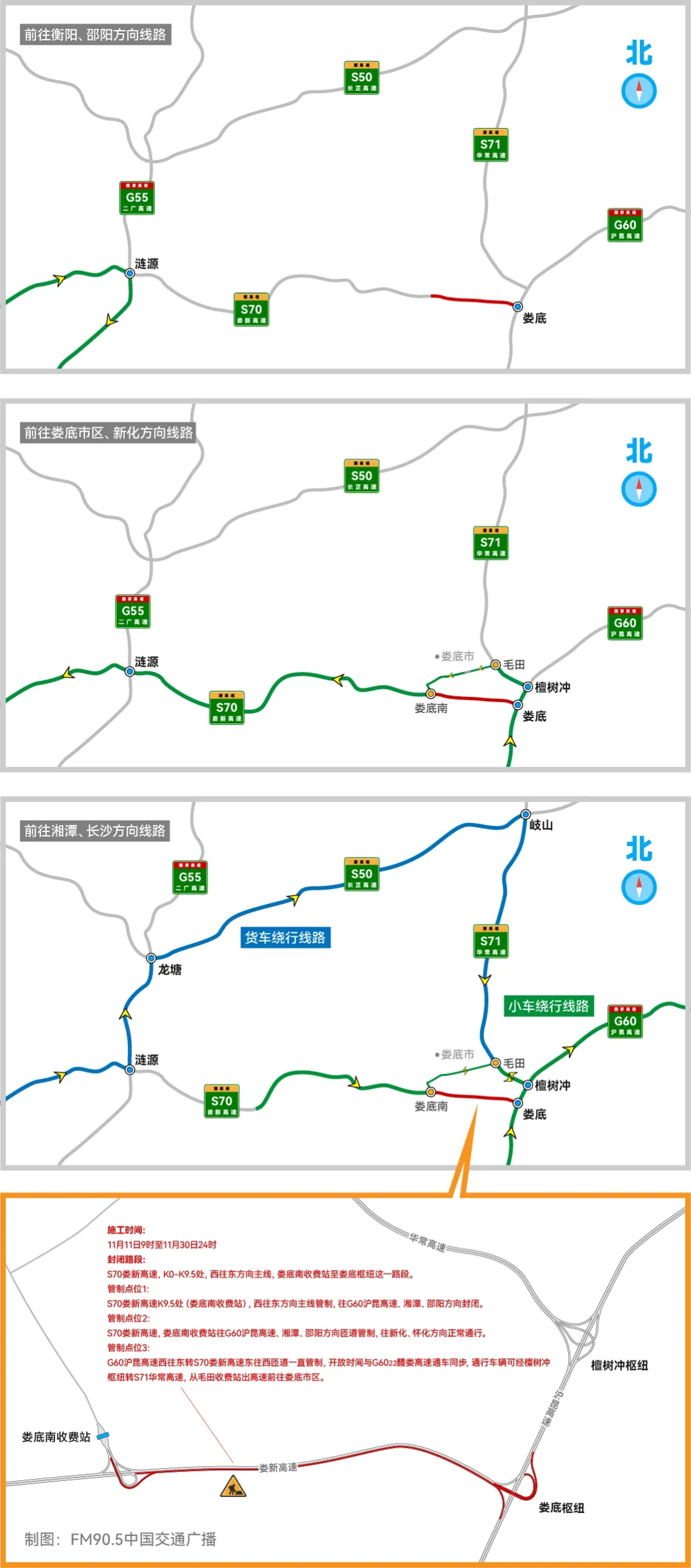 11月6日,本台记者从湖南省高速公路交通警察局娄底支队、湖南省高速公路集团有限公司娄底分公司了解到,S70娄新高速娄底南收费站至娄底枢纽(娄新高速0-9.5KM)路段将于11月11日9时起至11月30日24时处于封闭管制状态,车辆无法通行,目的是为配合G6022醴娄高速建设施工。近期需途经该路段的驾驶员朋友请合理规划路线,注意绕行。
