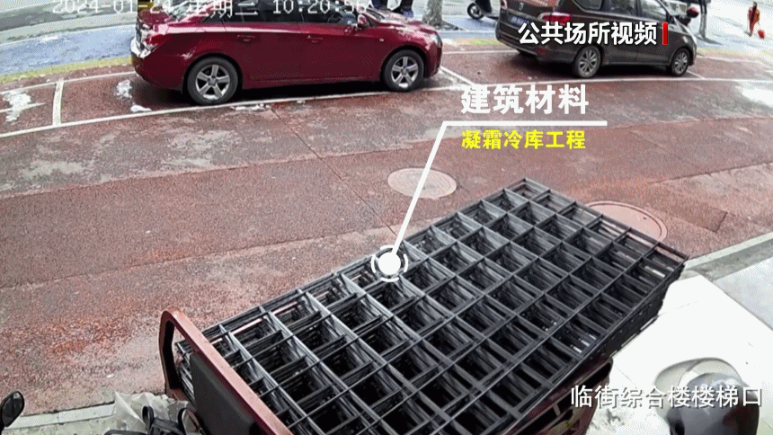 10点20分,一名戴着白色头盔的男子骑着一辆载有大量方格网状建筑材料的三轮车停放到综合楼前,一名工人帮忙将建筑材料卸载下来。
