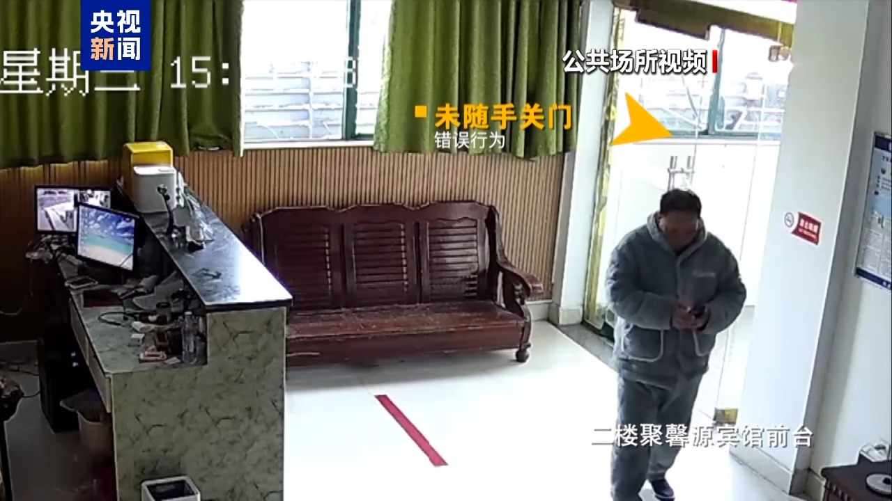 15点03分,二楼聚馨源宾馆前台一名身穿厚厚绒衣的男子打开玻璃门走出宾馆,几分钟后他又回到宾馆,值得注意的是,他打开玻璃门后并没有随手关上,而正是这样一个小小的错误举动,会让有毒浓烟直接涌入宾馆内。