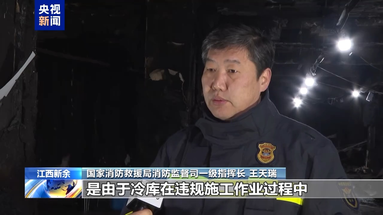 国家消防救援局消防监督司一级指挥长 王天瑞:经过调查组深入细致调查,这次火灾的原因是由于冷库在违规施工作业过程中产生的静电引燃易燃气体导致的。