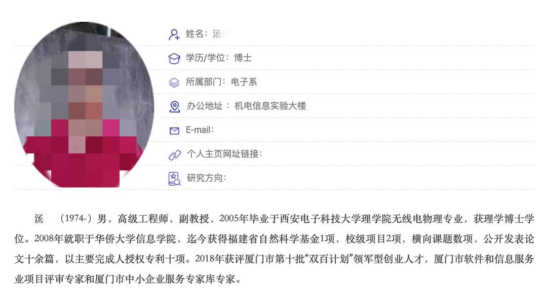 因言论被推到风口浪尖的汤某是一位怎样的老师?华侨大学信息科学与工程学院官网显示,汤某为高级工程师,副教授。2005年毕业于西安电子科技大学理学院无线电物理专业,获理学博士学位。2008年就职于华侨大学信息学院,迄今获得福建省自然科学基金1项,校级项目2项,横向课题数项,公开发表论文十余篇,以主要完成人授权专利十项。2018年获评厦门市第十批“双百计划”领军型创业人才,厦门市软件和信息服务业项目评审专家和厦门市中小企业服务专家库专家。