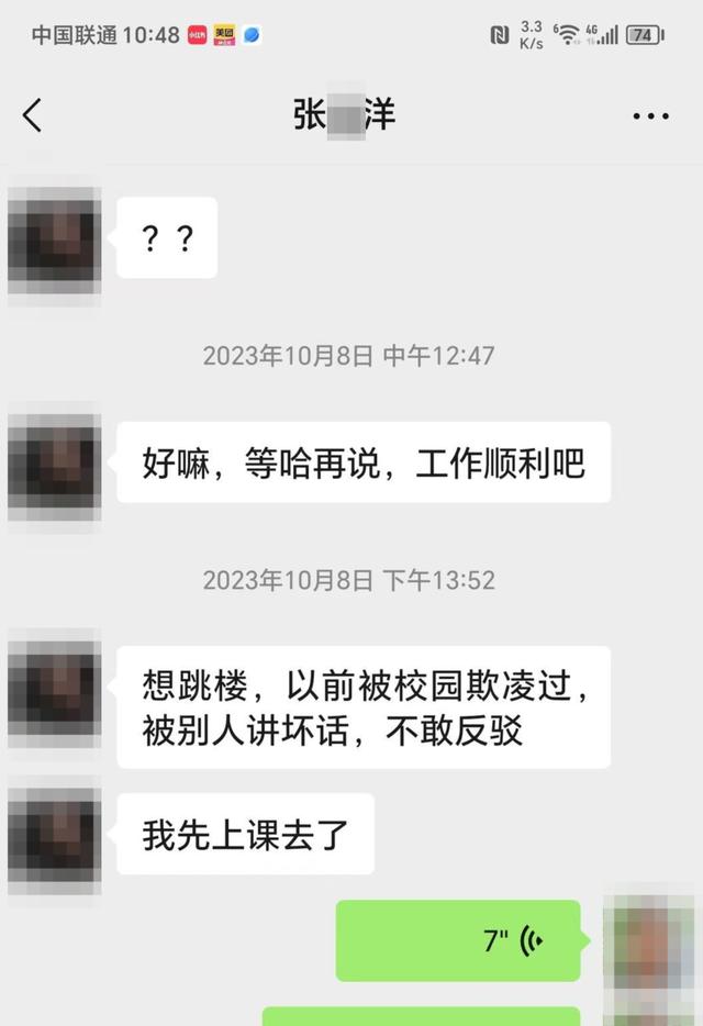 ▲张某洋自称曾遭校园欺凌的聊天记录截图