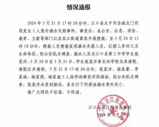 红星新闻此前报道,5月24日,有用户在短视频平台发布消息称,贵州铜仁市江口县某中学男孩于5月21日在河边溺水,家长怀疑其是被威逼欺骗下水。5月25日晚,江口县双江街道办事处通报,溺水失联的学生被打捞上岸,但已无生命体征。经公安机关调查,该学生与多人结伴游泳,未受到胁迫,系自行下河游泳溺水意外死亡。