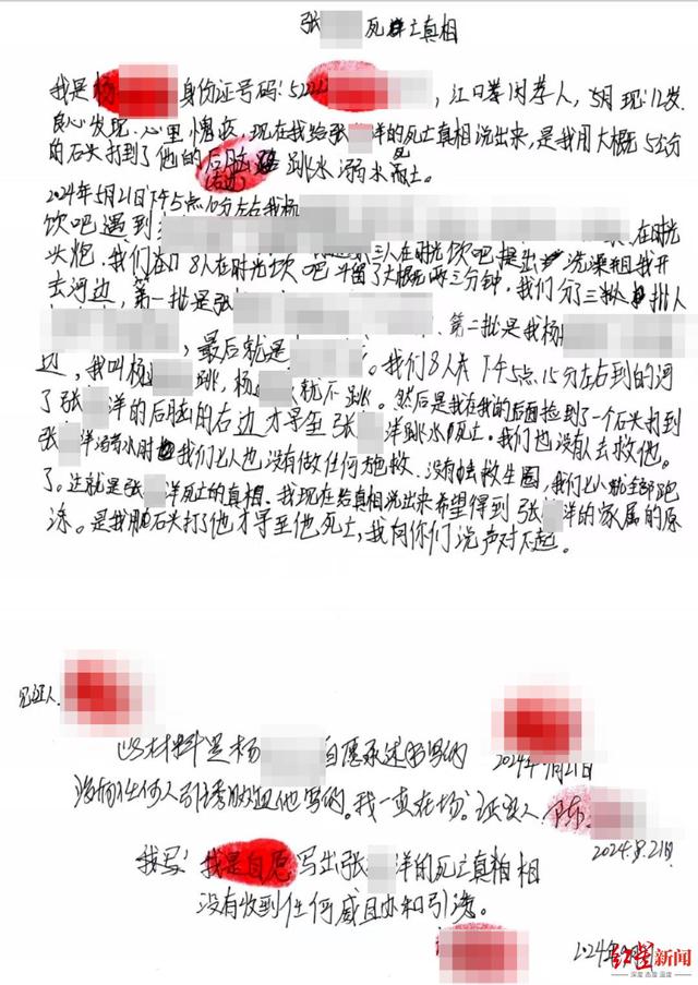 手写稿多处按有红色指印,内容显示,杨某煜、张某洋与另外6人于5月21日下午到河边,杨某煜曾捡了一块石头打张某洋右脑后边,导致其跳水死亡。“我们也没有人去救他,张某洋溺水时我们七人没有做任何施救,没有丢救生圈,我们七人就全部跑了。这就是张某洋死亡的真相,我现在给(把)真相说出来希望得到张某洋的家属的原谅。是我用石头打了他才导至(致)他死亡,我向你们说声对不起。”手写稿中写道。