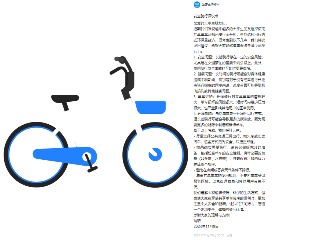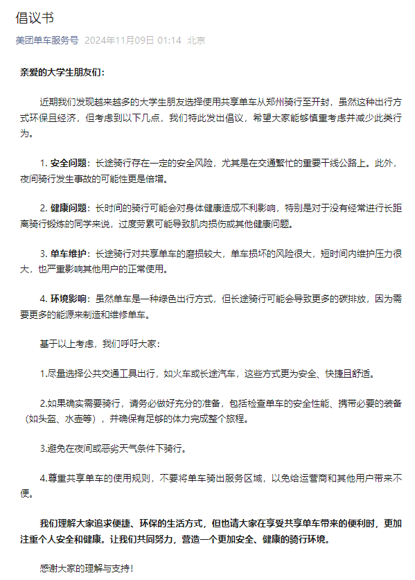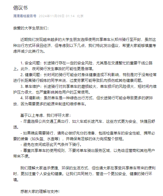 亲爱的大学生朋友们:近期我们发现越来越多的大学生朋友选择使用共享单车从郑州骑行至开封,虽然这种出行方式环保且经济,但考虑到以下几点,我们特此发出倡议,希望大家能够慎重考虑并减少此类行为:1. 安全问题:长途骑行存在一定的安全风险,尤其是在交通繁忙的重要干线公路上。此外,夜间骑行发生事故的可能性更是倍增。2. 健康问题:长时间骑行可能会对身体健康造成不利影响,特别是对于没有经常进行长距离骑行锻炼的同学来说,过度劳累可能导致肌肉损伤或其他健康问题。3. 单车维护:长途骑行对共享单车的磨损较大,单车损坏的风险很大,短时间内维护压力很大,也严重影响其他用户的正常使用。4. 环境影响:虽然单车是一种绿色出行方式,但长途骑行可能会导致更多的碳排放,因为需要更多的能源来制造和维修单车。- 尽量选择公共交通工具出行,如火车或长途汽车,这些方式更为安全、快捷且舒适。- 如果确实需要骑行,请务必做好充分的准备,包括检查单车的安全性能、携带必要的装备(如头盔、水壶等),并确保有足够的体力完成整个旅程。- 尊重共享单车的使用规则,不要将单车骑出服务区域,以免给运营商和其他用户带来不便。我们理解大家追求便捷、环保的生活方式,但也请大家在享受共享单车带来的便利时,更加注重个人安全和健康。让我们共同努力,营造一个更加安全、健康的骑行环境。