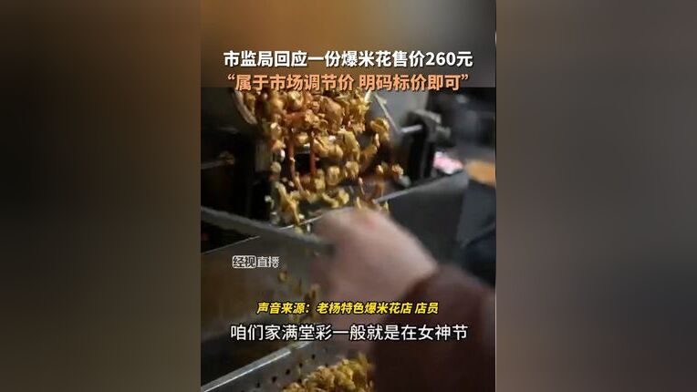 市监局回应一份爆米花售价260元:属于市场调节价,明码标价即可。