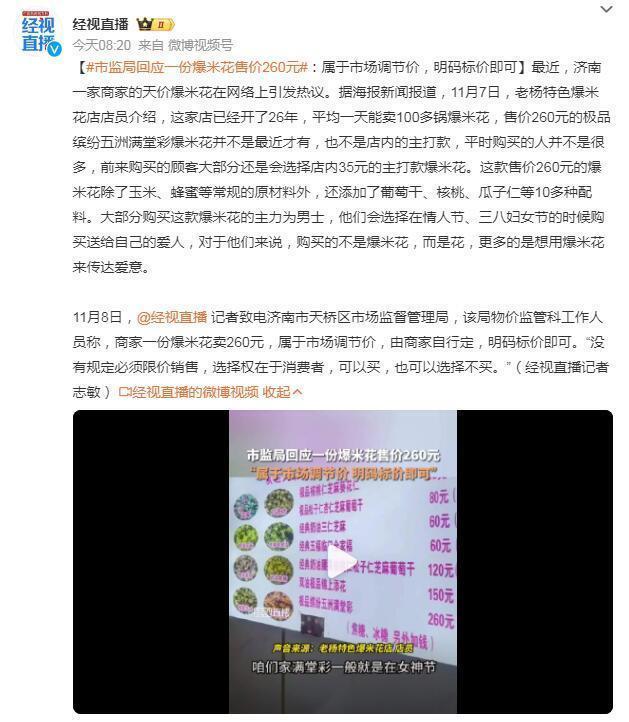 11月8日,@经视直播 记者致电济南市天桥区市场监督管理局,该局物价监管科工作人员称,商家一份爆米花卖260元,属于市场调节价,由商家自行定,明码标价即可。“没有规定必须限价销售,选择权在于消费者,可以买,也可以选择不买。”