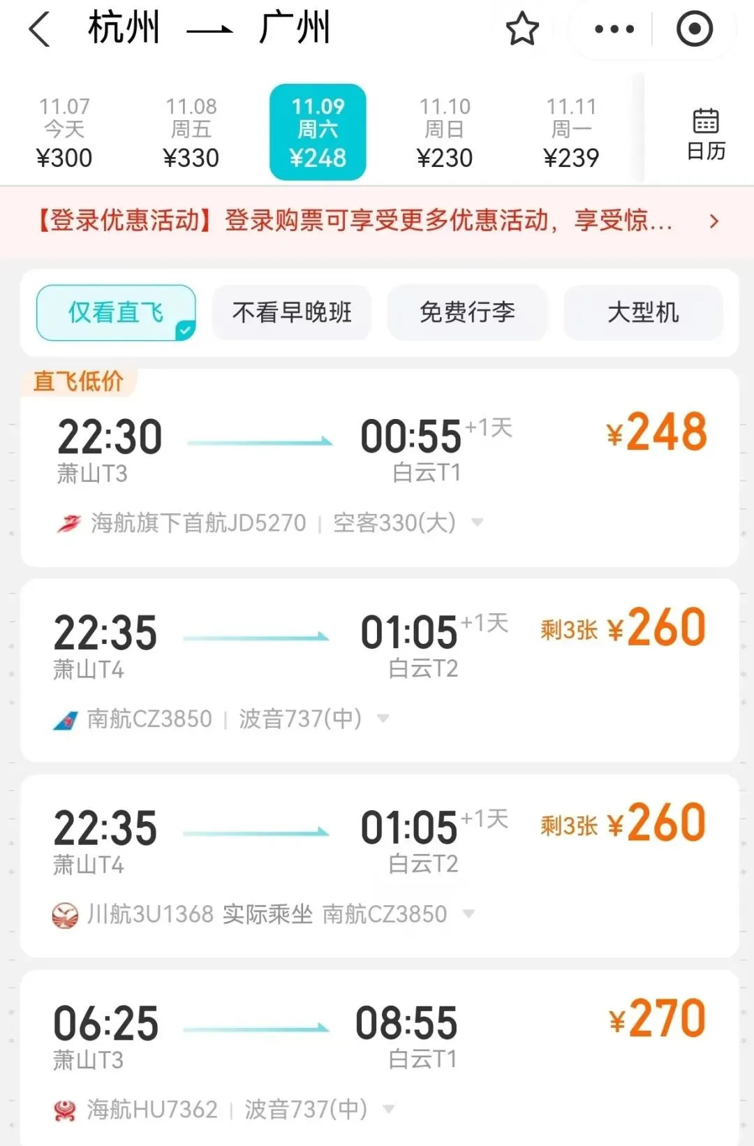 某旅游网站机票价格截图