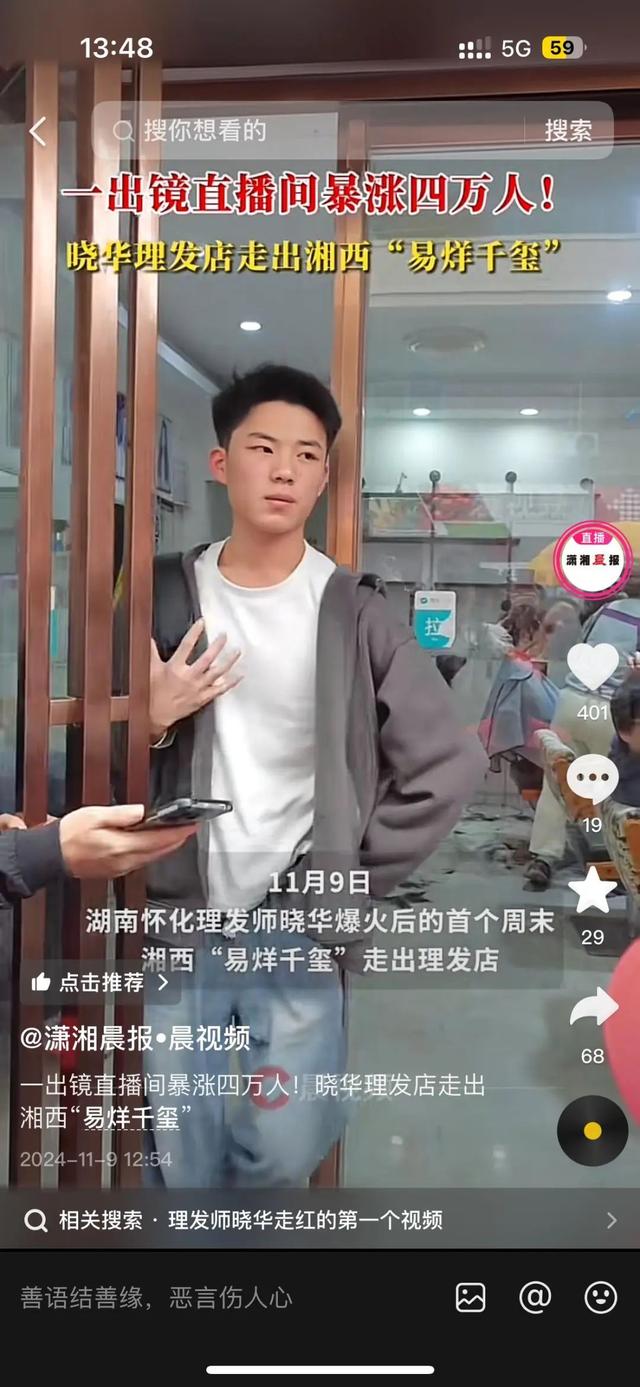 上午11点半左右,晓华剪到当天的第4号男生时,给男生设计剪裁的头发造型酷似男明星易烊千玺,直播间人气高涨。