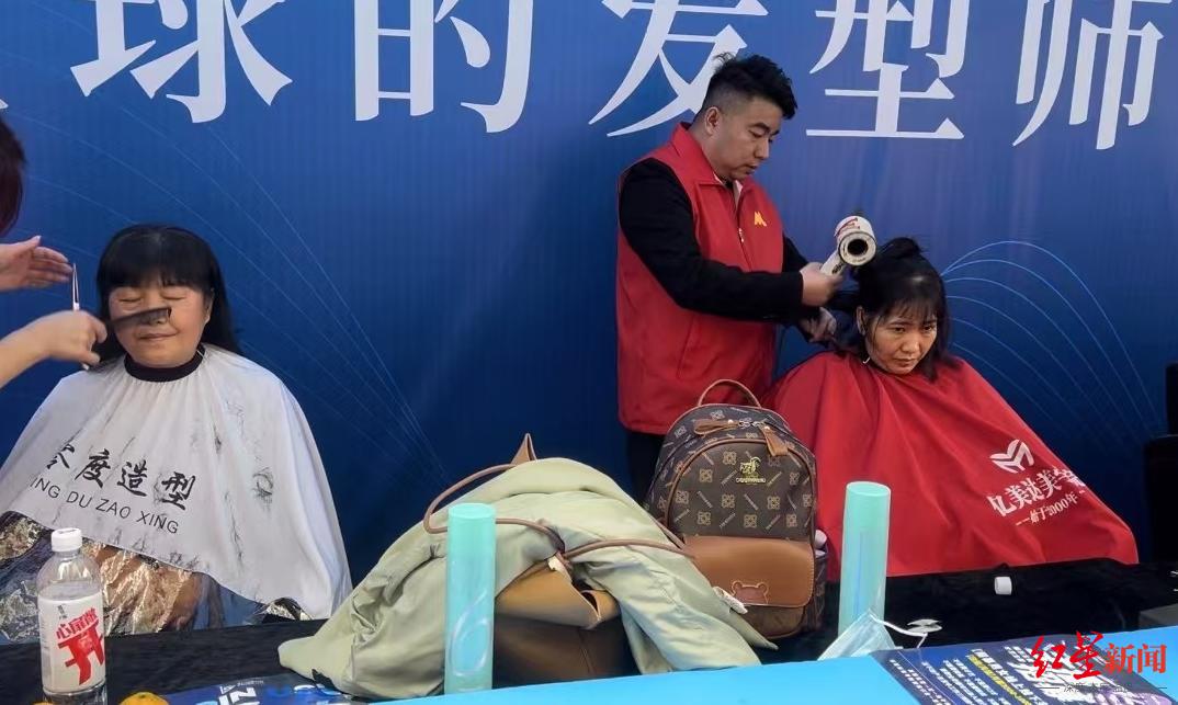 此外,怀化市鹤城区美容美发行业协会支起摊位,在晓华理发店门口邀请理发师免费公益理发,除了本地的,还有来自广州、长沙的“托尼”加入进来,切磋技术,门口也排起了长队。