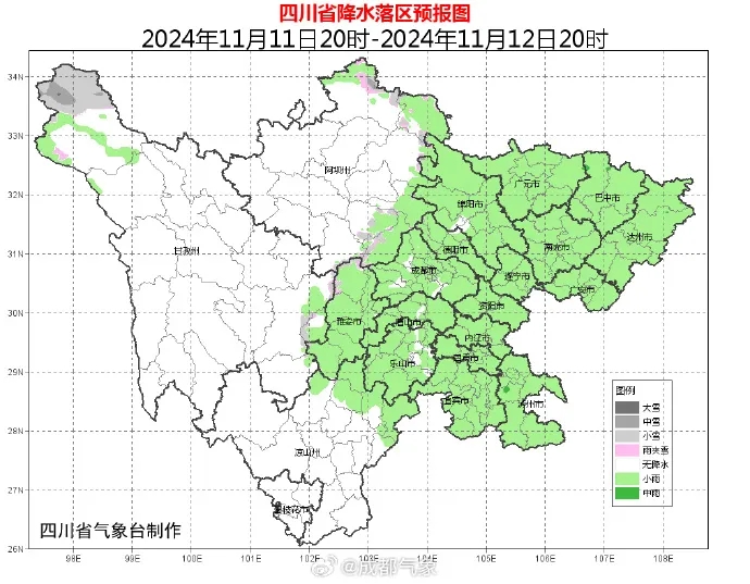 11日晚上到12日白天:盆地各市阴天有小雨或零星小雨;川西高原和攀西地区以晴间多云天气为主,其中甘孜州西北部、阿坝州东部和凉山州东北部有分散阵雨(雪)。