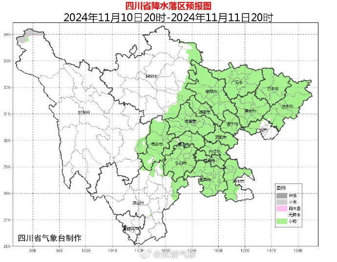 今天晚上到明天白天:盆地各市阴天有小雨或零星小雨;川西高原和攀西地区以晴间多云天气为主,其中凉山州东北部局地有分散阵雨。