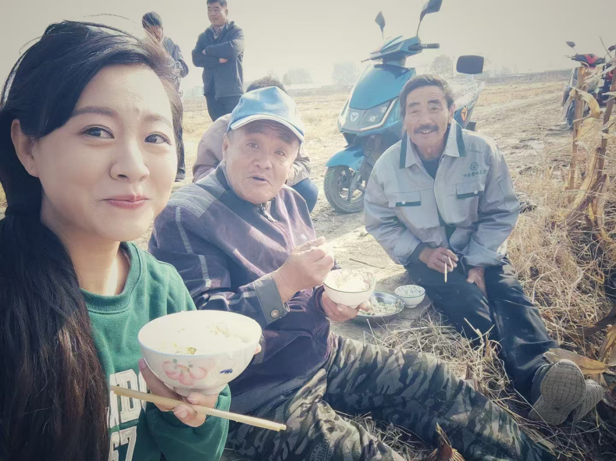 当天拍摄结束,彭勃和村民在地头吃饭。赵婶给田里收稻子的农民送饭,自己种的稻米饭、炖豆腐。 受访者 供图