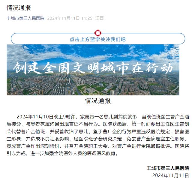 2024年11月10日晚上9时许,家属带一名患儿到我院就诊,当晚值班医生曹广金酒后接诊,与患者家属沟通出现言语不当行为。医院获悉后,第一时间派出主任医生曾剑荣代替曹广金值班,并妥善收治了患儿。鉴于曹广金的行为严重违反医院规定,损害医生形象,并造成不良社会影响,经医院班子会研究决定,免去曹广金病理室主任职务,责成曹广金作出深刻检讨,并召开全院职工大会,对曹广金进行全院通报批评。医院将引以为戒,进一步加强全院医务人员的医德医风教育。